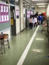 廊下に子供たちが書いた書き初めが展示されています。1年生と2年生は鉛筆で、3〜6...