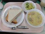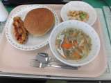 今日の給食は、フィッシュサンド・ヌードルスープ・ビーンズサラダ です。 にんに...