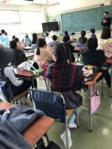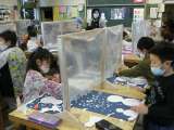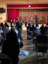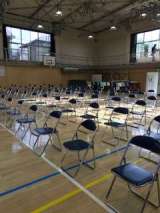 1回目の公演が終わり、体育館は消毒と換気をしています。 体育館後方では、家庭科の...