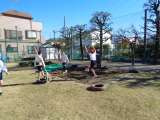 体育は校庭で、ベースボール型ゲームをしています。各クラスでルールが少し違うようで...