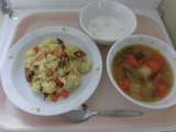 今日の給食は、 *パエリア *白インゲンの田舎風スープ *ピーチヨーグルト 米 ...