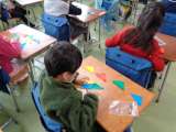算数は「かたちづくり2」です。色の違う三角の折り紙を使います。「スー」「クル」「...