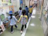 1年生が、2年生に案内されながら学校探検を行いました。部屋のドアには、2年生が作...