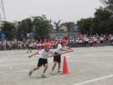 3年生の競技は「3年生タイフーン」。二人で棒をもってカラーコーンを回ります。棒を...