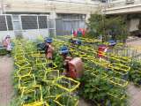 1年生が毎日お世話をしているあさがお。支柱をしたあとは、どんどん大きく育っていま...