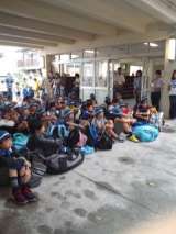 学校に到着しました。少し雨が残っていたためピロティで到着式です。 たくさんの保護...