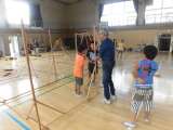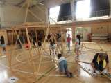 木材を輪ゴムでつないで、どんどん高く、広く組み立てられています。大人も協力してい...