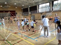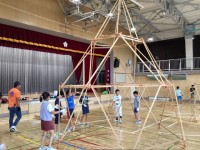 「空間ワークショップ」では、体育館で木材とゴムを使い、実物大の家(基地)を作りま...