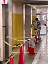 階段の壁の色塗りが終わりました。階段の色は、東階段がピンク、中央階段が黄色、西階...