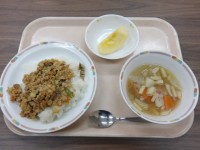 鶏そぼろ丼 のっぺい汁 くだもの 牛乳