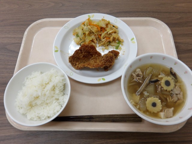 ごはん(有機米) みそかつ 油揚げと野菜のおひたし 冬瓜汁 牛乳