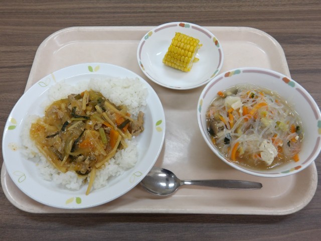 スタミナ丼 春雨スープ とうもろこし 牛乳
