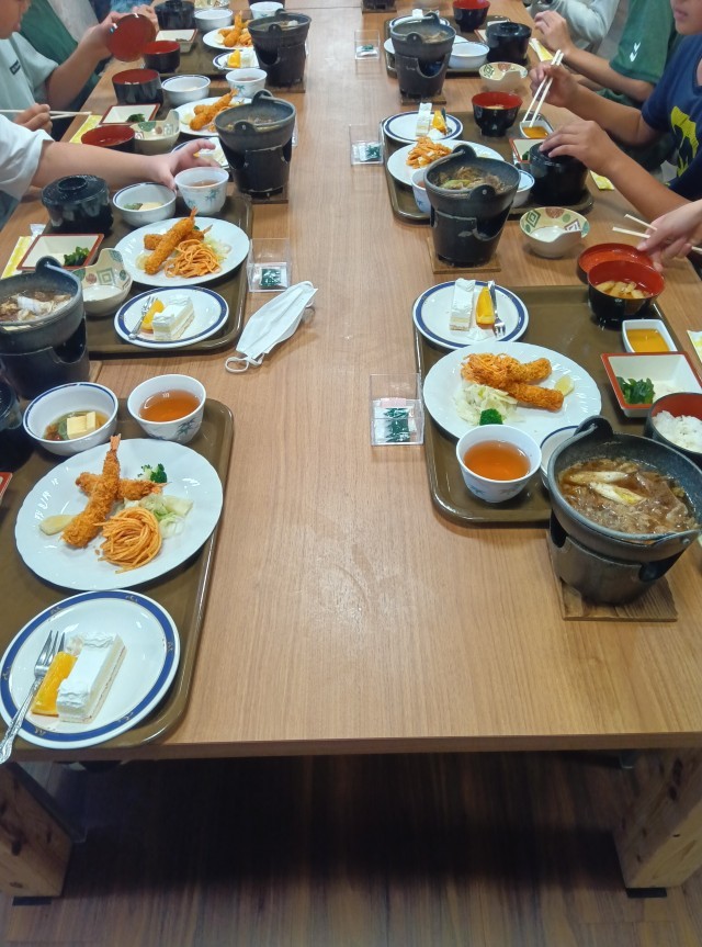みんなと食べる夕食です。友達と楽しく食べていました。
