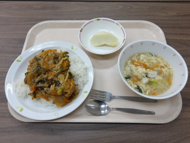 夏野菜の豚キムチ丼 豆腐とたまごのスープ くだもの 牛乳