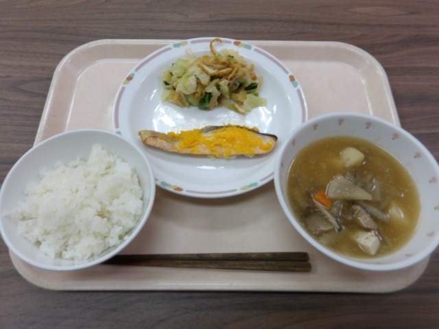 ごはん 魚の紅葉焼き からしあえ 利休汁 牛乳