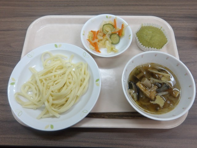 きのこうどん 野菜の酢じょうゆかけ 日本茶蒸しパン 牛乳