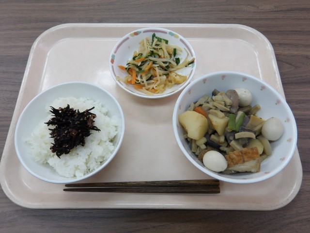 ごはん(有機米) 梅の実ひじき おひたし がめ煮 牛乳