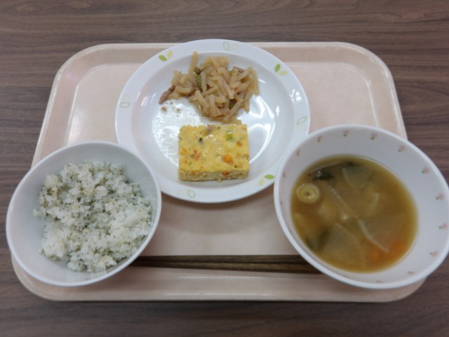 しそごはん 擬製豆腐 こんにゃくの甘辛炒め お事汁 牛乳