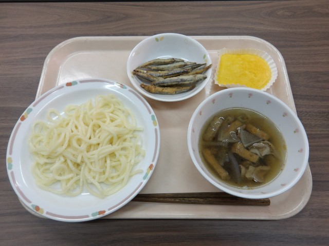 冬至うどん 小魚の米粉揚げ かぼちゃ蒸しパン 牛乳