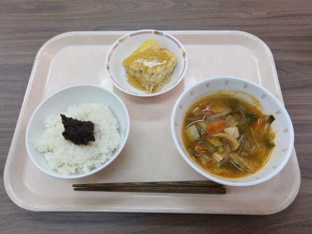 ごはん 海苔の佃煮 擬製豆腐 ごまキムチ汁 牛乳