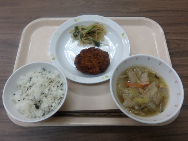 わかめごはん イカメンチ にんにくじょうゆあえ せんべい汁 牛乳