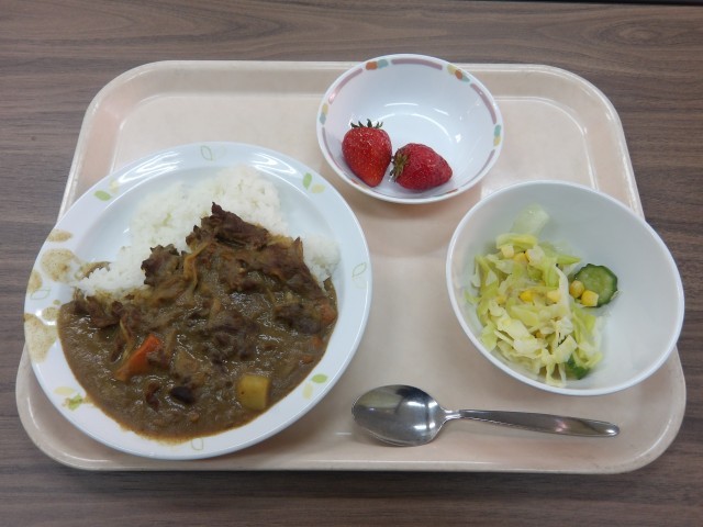 ビーフカレーライス コーンサラダ くだもの 牛乳