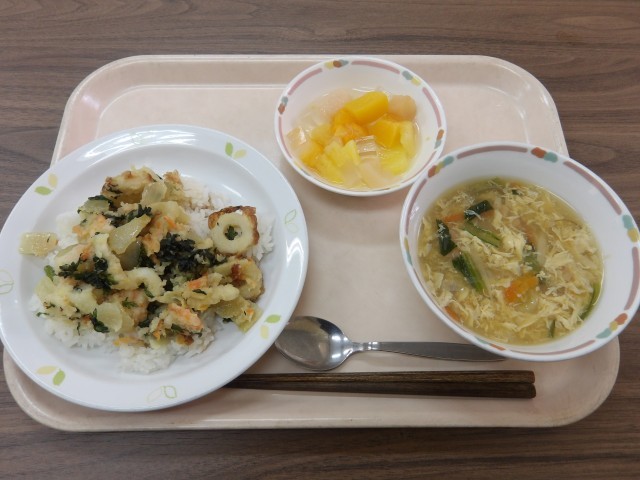 えびといかのバラ天丼 かきたま汁 フルーツカクテル 牛乳