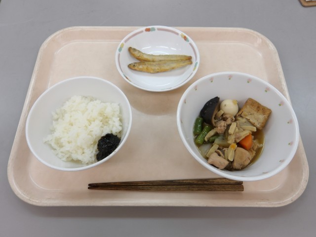 ごはん(有機米) 海苔の佃煮 小魚の米粉揚げ 春野菜のうま煮 牛乳
