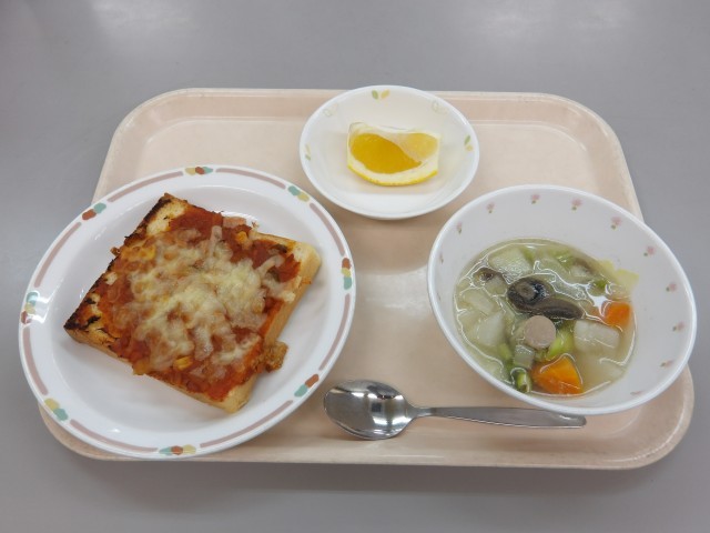 ツナピザトースト 春野菜のポトフ くだもの 牛乳