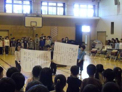 今日は五年生の発表がありました。合唱は「あすという日が」という歌で、きれいなハーモニーが心をさわやかにしてくれました。合奏は「テキーラ」。メキシコのリズムが軽快に響き、体が自然に動き出してしまいました。最後に全校児童もいっしょに「あすという日が」を歌いました。気持ちのよい朝のスタートになりました。