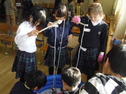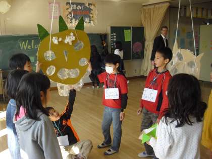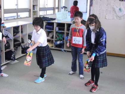 今日、清泉インターナショナルの三年生を迎えて、交流会を行いました。前回はインターに招待されたので、今回は土曜日に行われる「こどもまつり」を、少し早くいっしょに楽しみました。教室はゲームセンターに変身しました。まめまき、はねつき、おはしのまめつかみなど、ゲームの中に日本の文化に触れる工夫がされているものもありました。みんな遊びながらお友達になれたようです。