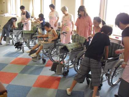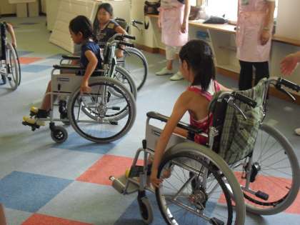 夏休みになり一週間がすぎました。学校のプールや補習に毎日たくさんの子が来ます。プールでは検定がありました。上の級に進めた子もずいぶんいました。今日のふれあい教室は「めざせ 車いすの達人」という名前で、上野毛地区社会福祉協議会のみなさまの協力をいただき、車いすのしくみや使い方を体験しました。お年寄りの方や体の不自由な方のことが、少し理解できたようです。