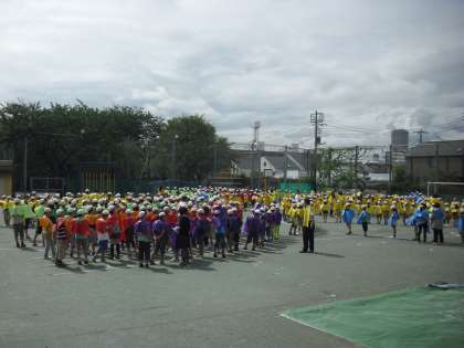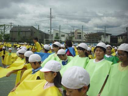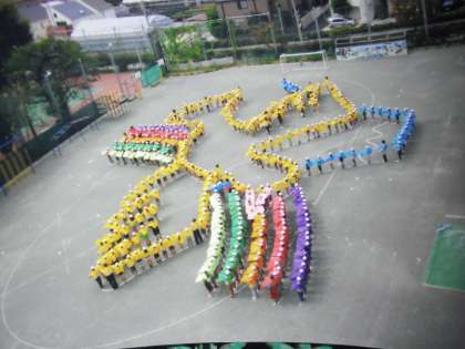 昨日、台風20号により変わりやすい天気の中、開校55周年を祝う記念の航空写真撮影が行われました。児童が考えた人文字の図案をもとに、校庭いっぱいにカラーエプロンで色分けされた人文字が、飛行機により撮影されました。写真は下敷きとなり全員にプレゼントされます。お楽しみに。