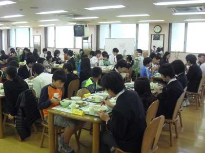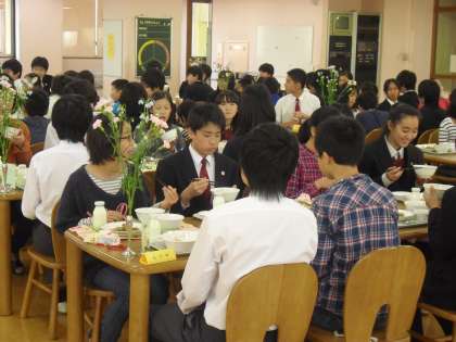今日から、玉川中学校の生徒さんと中町小学校の児童が、ランチルームでいっしょに給食を食べます。今日のクラスは中学校は3年生、小学校は6年生でした。さすがに最高学年同士、生花が飾られたテーブルで落ち着いた会食ができました。また、午後には学校関係者評価委員会が開かれ、今年のアンケート作成の検討会が行われました。今月13日には家庭にアンケート用紙が配布されます。ご協力よろしくお願いいたします。