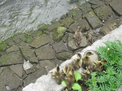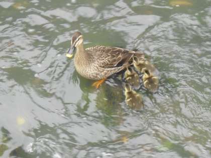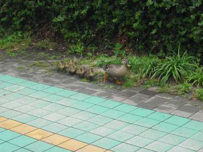 運動会練習の続く中、中町小学校でカルガモの雛が巣立ちました。2階昇降口の茂みに卵を産み、温めていたのですが、知らないうちに10羽が育っていました。今日27日の朝、母カモに連れられて、矢沢川に巣立ちをしました。校庭を越え、道路を歩き、矢沢川に飛び込む大冒険に感動しました。全校の児童にも見せてあげたい光景でした。