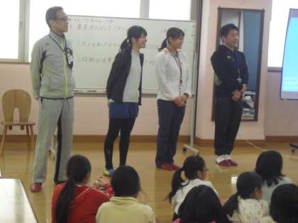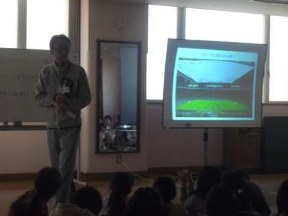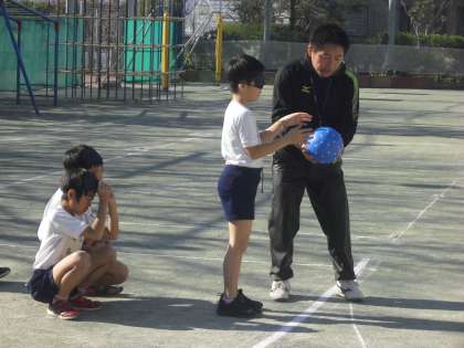 4年生の「未来教室」で、ミズノ株式会社から出前授業に来ていただきました。スポーツを通して社会貢献を目指す仕事を進めています。ブラインド・サッカーも体験できました。