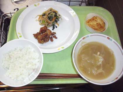 今日から新年度の給食が、始まります。今日の献立は、桜ごはん、牛乳、豚肉の甘辛煮、野菜のからしじょうゆ、野菜のみそ汁、ミニレーズンケーキです。