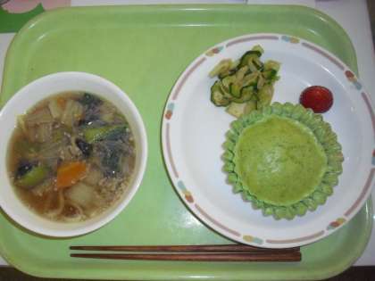 今日の献立は、チャンポン麺、牛乳、野菜の中華和え、米粉青葉蒸しパン、いちごです。ほうれん草をゆでて、ピューレにして、若葉色の蒸しパンをつくりました。