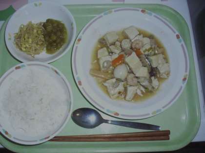 今日の献立は、ごはん、牛乳、うぐいす豆の甘煮、小大豆もやしのごま風味、豆腐の五目炒めです。うぐいす豆の甘煮は、青エンドウ豆を柔らかくなるまで煮て、砂糖で味付け