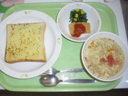 今日の献立は、ガーリックトースト、牛乳、いかのチリソースかけ、ほうれん草とコーンのソテー、トマトと卵のスープです。ほうれん草たっぷりのソテーをだしました。ほうれん草は、カロテンなどの栄耀がたっぷり入っている野菜です。