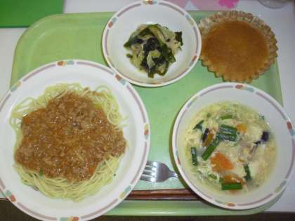 今日の献立は、ジャージャー麺、海草サラダ、ニラ玉スープ、マーラーカオ、牛乳です。