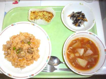 今日の献立は、チキンライス、牛乳、スパニッシュオムレツ、ヒジキサラダ、