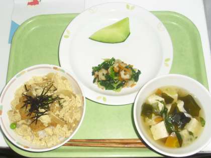 今日の献立は、カツ丼、牛乳、ほうれん草と竹輪のごまあえ、すまし汁、メロンです。