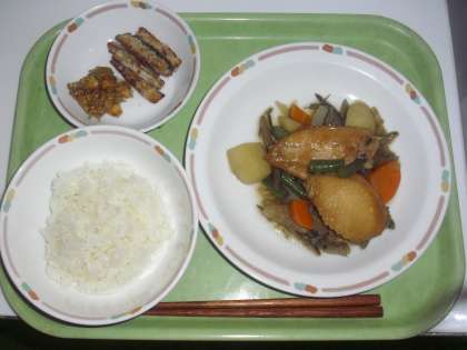 しました。献立は、ごはん、牛乳、大豆とじゃこの甘辛揚げ、かみかみごぼう、鶏手羽中と野菜の煮物です。