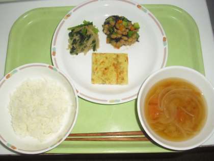 今日の献立は、ごはん、牛乳、五目納豆、擬製豆腐、小松菜と切干のハリハリ漬け、トマトのみそ汁です。トマトにはうま味があるので、おいしいみそ汁になります。