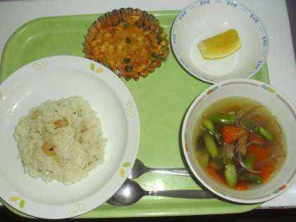 今日の献立は、ガーリックピラフ、牛乳、フィッシュローフ、グリーンアスパラのスープ、美生柑です。フィッシュローフはツナや野菜をマヨネーズであえて、オーブンで焼きます。