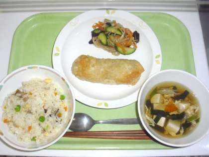 今日の献立は、チャーハン、牛乳、春巻き、野菜ときくらげのサラダ、ニラ玉スープです。中華料理では、きくらげを良く使います。今日はサラダに入れて中華風サラダにしました。