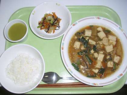 今日の献立は、ごはん、牛乳、四川豆腐、野菜の塩こんぶあえ、さつまいもの水ようかんです。さつまいもの水ようかんは、さつまいもを蒸してつぶし、寒天で固めて冷しました。