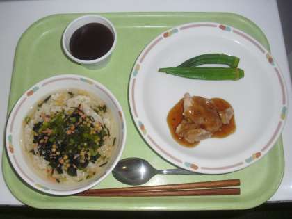 今日の献立は、鮭茶漬け、牛乳、蒸しどり、おくらのおひたし、水ようかんです。鮭を焼いてからほぐし、お茶漬けのぐにして、だし汁をかけて食べます。