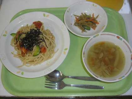 今日の献立は、トマトのサラダスパゲッティ、牛乳、ごぼうサラダ、ジュリアンスープです。トマトを入れた冷たいスパゲッティを出しました。